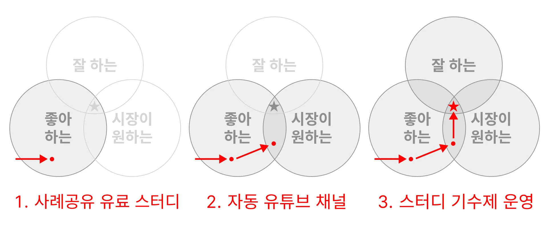 이 방법의 취지는 유료 스터디를 계속 해서 돈 벌자는 게 아닙니다. 내가 좋아하면서 사람들이 돈을 낼 주제를 찾아가고, 그 과정에서 전문가가 되어, 최종적으로 내가 평생 할 수 있는 일을 찾자는 것입니다!
